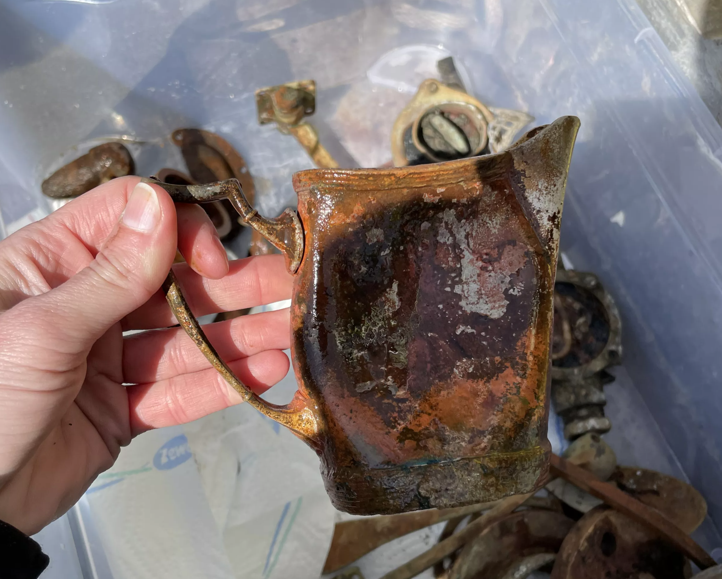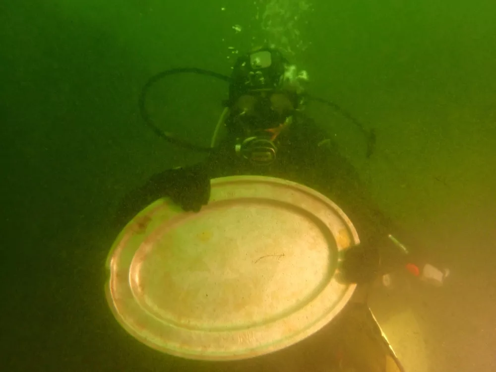 Während der Arbeiten dokumentierten wir ein ausgedehntes Fundgebiet mit größeren Metallteilen und weiteren Gegenständen, darunter Gefäße, die sich als silberne Tee- und Kaffeekannen herausstellten. Aufgrund des Umfangs der Funde war klar, dass weitere Tauchgänge erforderlich waren.